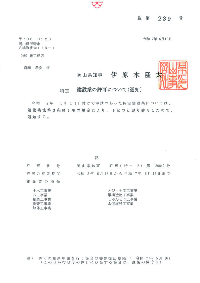 | 免許番号 | 建設業許可 岡山県知事 許可(特-7)第20642号・(般-7)第20642号 |